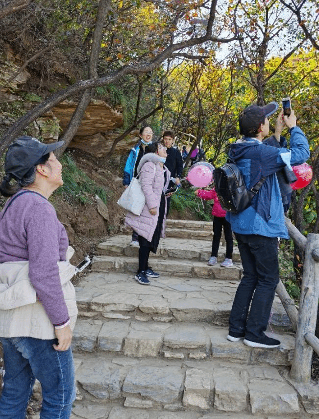坡峰岭,位于北京市西南房山区周口店镇黄山店村境内西北3km处,毗邻北京宝金山玉虚宫。2009年开始,从一个荒山先行修通了长达6000米的山路。坡峰岭坡起处多种以柿树、核桃、桃树、山杏、杨树分布,伴生野酸枣、野山梨、野山菊等。半坡抬阶而上,蜿蜒小路两侧以自然生高大黄栌为重多,伴生麻榆、麻全子、酸枣、山荆等。高坡处又以高大黄栌、栾树、杨树密集分布。其中,红叶有元宝枫、黄栌、火炬等七八个品种、数万株。十一以后天气转凉,山上红叶树种进入观赏时期,老师们结伴而行,感受"红叶绿中游,彩练当空舞"的美丽景色。上下感受从古到今,这个农耕民族精心使用着脚下的每一寸土地,获取食物的活动和非凡智慧,无处不在。老师们登山赏红叶的同时,锻炼了身体,陶冶情操。