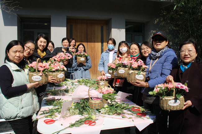 在新竣工的教职工之家,干净明亮的小院,整齐有序的沙发,错落有致的书架,书香气息浓厚,衬托出职工之“家”的温馨与舒适。30余名女老师参加首场“品咖啡、学插花”活动。老师们时不时地停下来进行交流讨论,精心展示自己的手工能力和创新想象力。