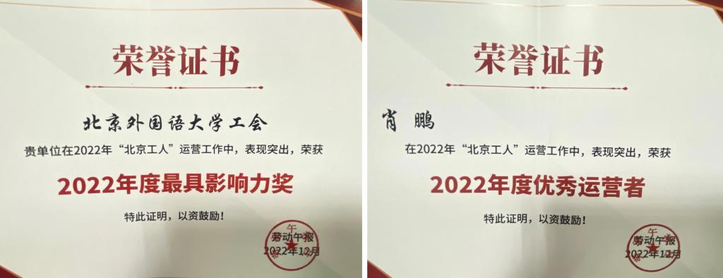 近日,北外工会因在“北京工人”运营工作中表现突出,荣获北京市总工会《劳动午报》评选的“2022年度最具影响力奖”,工会肖鹏老师因个人表现突出,荣获“2022年度优秀运营者”荣誉称号。