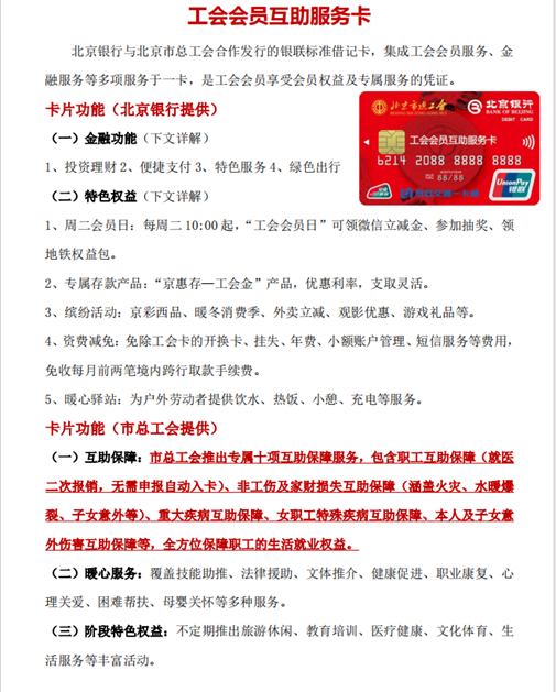 京卡,全称工会会员互助服务卡,它是北京市总工会推出的集多种功能为一体的服务卡。工会会员可持此卡享受到市总工会免费提供的非工伤意外伤害及家庭财产损失保障计划,同时工会会员持卡还可获得包括法律咨询、法律援助、职业介绍、困难帮扶的服务,以及职业康复、文化体育、旅游休闲等多个领域的免费服务或特惠服务。