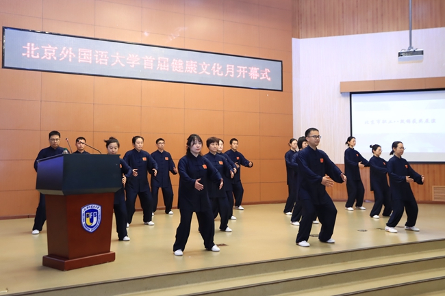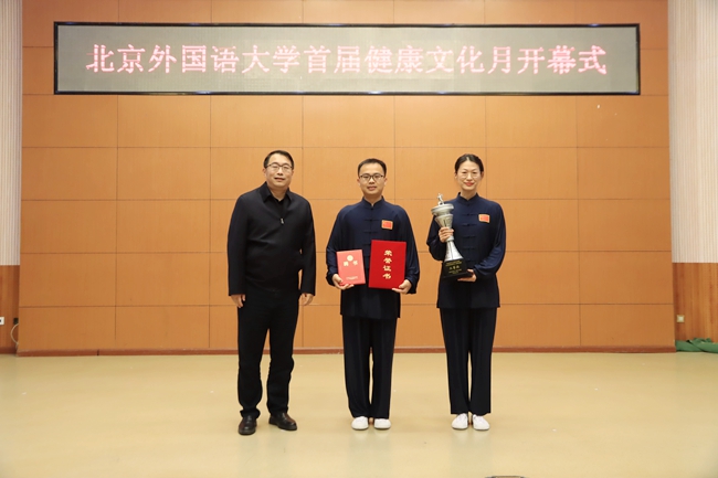 开幕式上,发布了北外首届健康文化月系列活动,成立了北外教职工传统体育养生协会。丁浩为协会指导教师胡少辉颁发聘书,为北京市2025年八段锦获奖代表队颁发证书和奖杯。学生通过朗诵形式向全校师生发出健康倡议,教职员工进行八段锦获奖展演。为争取专业资源支持学校健康校园建设,北外与国家心血管病中心健康生活方式医学中心达成合作意向。