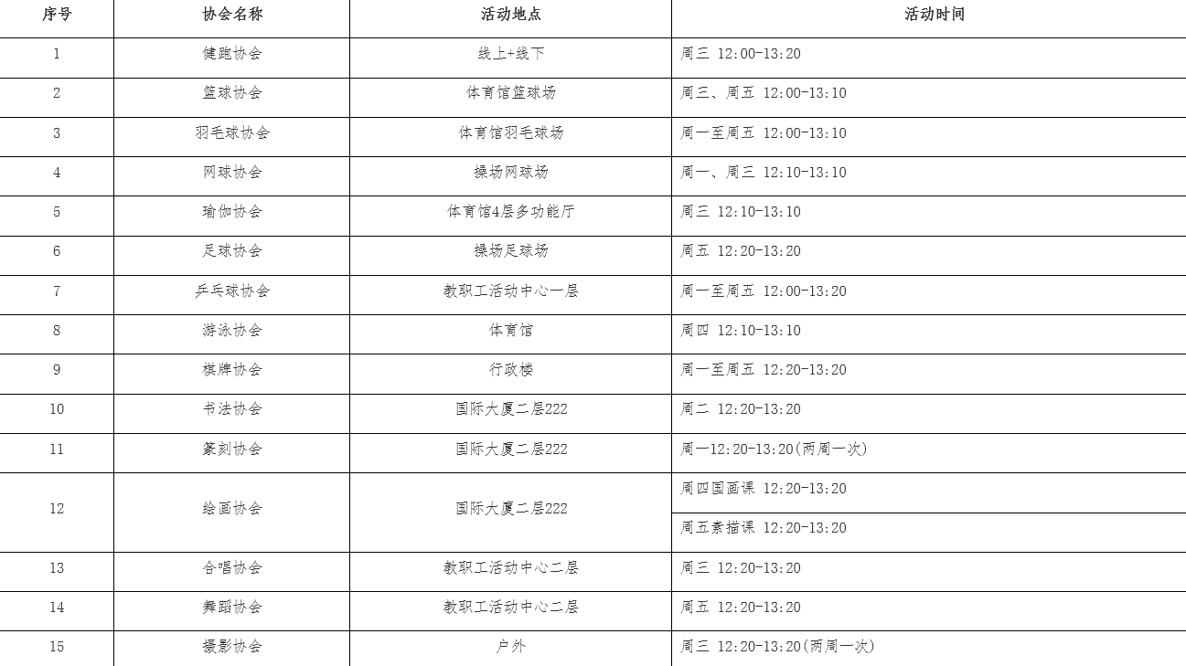 各部门工会: 为进一步提升职工综合素养,营造健康、快乐的工作氛围,丰富文体生活,促进教职工交流,共同打造“一社一品”特色协会(社团),不断提升教职工的获得感、幸福感,为学校高质量发展凝聚力量。现将2024年春季学期各教职工文体协会(社团)的活动计划安排如下。