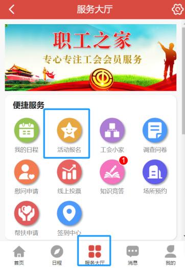 Ø 通过企业微信进入智慧工会系统,点击页面下方“服务大厅”后,找到“活动报名”图标。