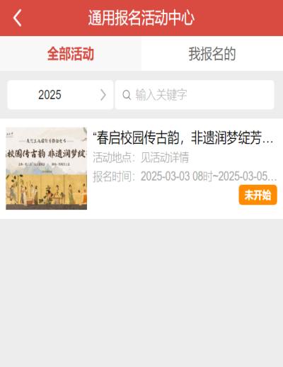 Ø 点击“活动报名”图标后,会看到目前在进行报名的活动,当到达活动时间后右下角状态会由“未开始”变为“进行中”,点活动名称即可进入报名详情页面。